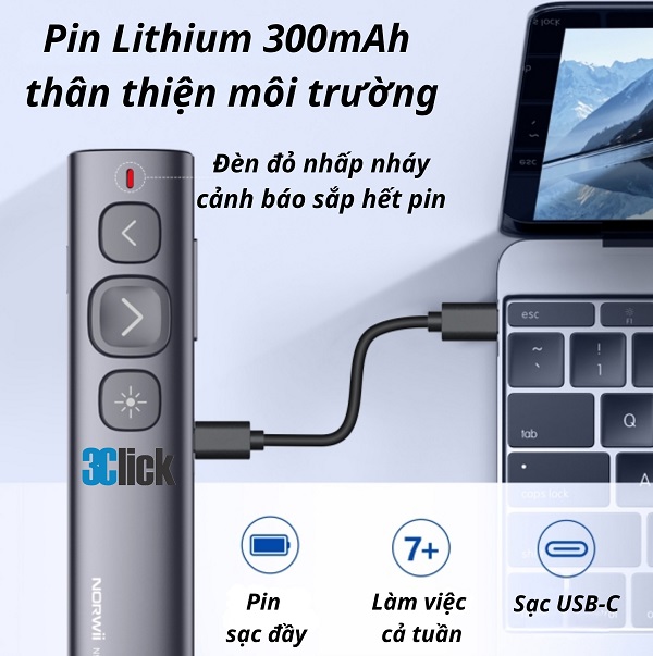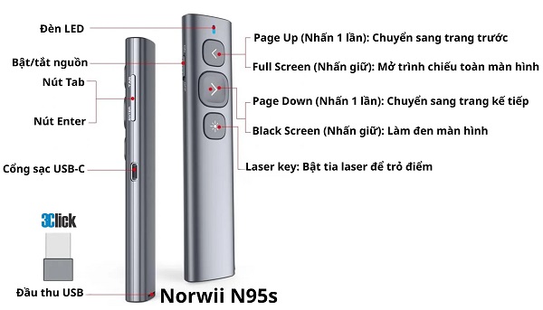 Bút trình chiếu tivi, màn hình Led Norwii N95s là dòng bút thuyết trình chuyên nghiệp được nhiều giảng viên, nhân viên văn phòng, MC và diễn giả tin dùng.Bút nổi bật với thiết kế tinh tế cho phép điều khiển con trỏ chuột, tích hợp laser đỏ và khả năng tương thích đa nền tảng Windows, macOS, Android .Nếu bạn vừa mua bút Norwii N95s mà chưa biết cách dùng, Công Nghệ 3C sẽ hướng dẫn chi tiết từng bước để bạn sử dụng hiệu quả nhất.