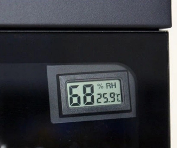 Quan sát màn hình LED hiển thị thông số ẩm ở góc trên bên phải của tủ. Nếu thấy thông số này chưa đạt yêu cầu, bạn xoay nhẹ núm cơ theo chiều trái - phải để chỉnh ẩm theo ý muốn.Ngay khi thao tác trên núm cơ, IC hút ẩm của thiết bị sẽ hạ hoặc tăng ẩm theo cài đặt sẵn có.