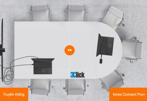 So với phương pháp truyền thống, nơi bạn bị hạn chế bởi chiều dài dây cáp hoặc phải ngồi ngay cạnh màn hình để thuyết trình trong các cuộc họp, với Innex Connect, bạn chỉ cần kết nối một dây cáp USB duy nhất và loại bỏ hoàn toàn sự lộn xộn của dây cáp.